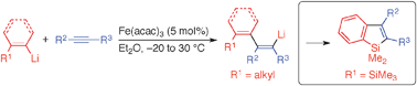 Phenyl- and vinyllithiums having an alkyl substituent at their ortho- and cis-position, respectively, readily added to alkynes in the presence of 5 mol% of Fe(acac)3. The reaction of o-(trimethylsilyl)phenyllithium with alkynes gave benzosiloles through an addition–cyclization sequence.