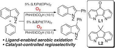 Palladium-catalyzed aerobic oxidative cross-couplings of indoles and benzene have been achieved by using 4,5-diazafluorene derivatives as ancillary ligands. Proper choice of the neutral and anionic ligands enables control over the reaction regioselectivity.
