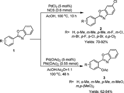 Efficient and facile catalytic protocols for chlorination and ligand-directed ortho-acetoxylation of 2-arylbenzoxazoles have been developed. The chlorination is not a ligand-directed ortho-functionalization, but an electrophilic substitution process in the benzo ring of the benzoxazole moiety. Meanwhile, the acetoxylation exhibited high regioselectivity for the substrates containing a meta-substituent and occurred at the less sterically hindered ortho-C–H bond of the directing group.