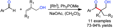 The author report an intermolecular hydroacylation of allylic alcohols with salicylaldehydes to afford β-hydroxy aryl ketones in 73–94% yields as single regioisomers. The reactivity and regioselectivity were promoted by catalytic amounts of a phosphinite that forms a dynamic covalent bond with the allylic alcohol. Hydroacylation of 1,2- and 1,1-disubstituted olefins generates β-hydroxy aryl ketones bearing tertiary and quaternary centers, respectively.