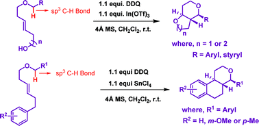 1-Benzyl ethers of (E)- and (Z)-hex-3-en-1,6-diols and hept-3-en-1,7-diols undergo a smooth oxidative cyclization with DDQ in the presence of In(OTf)3 through a sequential C–H bond activation and an intramolecular Prins cyclization to afford the corresponding trans- and cis-fused hexahydro-2H-furo[3,2-c]pyrans and octahydropyrano[4,3-b]pyrans respectively in good yields with an excellent stereoselectivity. Aryl tethered homoallylbenzyl ethers such as benzyl ethers of (E)- and (Z)-6-arylhex-3-enyl alcohols undergo a tandem Prins/Friedel–Crafts cyclization in the presence of stoichiometric amounts of DDQ and SnCl4via the benzylic C–H bond activation to furnish the corresponding trans- and cis-fused hexahydro-1H-benzo[f]isochromenes in good yields with complete stereoselectivity.