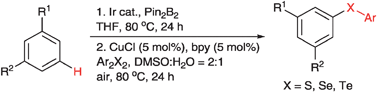 We report here the regioselective synthesis of aryl chalcogenides through the iridium-catalyzedmeta C–H borylation followed by copper-catalyzed C–S coupling reaction with chalcogenide sources in one pot, giving the 3,5-disubstituted aryl chalcogenides with high regioselectivity and good yields.