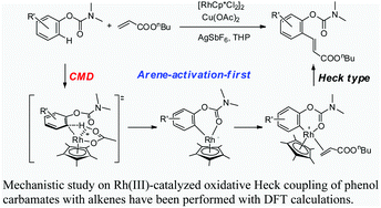 A systematic theoretical study on the Rh-catalyzed oxidative Heck-coupling of phenol carbamates with alkenes is carried out. Two possible mechanisms (i.e. arene activation-first and alkene activation-first mechanisms) are examined. As to the C–H activation step, four mechanisms including oxidative addition, electrophilic substitution, concerted metallation-deprotonation (CMD), and σ-bond metathesis are evaluated. The calculation results indicate that the arene activation-first mechanism is more favorable for the overall catalytic cycle. This mechanism involves three steps: arene C–H activation at the position ortho to the carbamate directing group affording a six-membered rhodiacycle intermediate, insertion of the alkene double bond into the Rh(III)–aryl bond, and a final β-H elimination step to release the product and re-generate the catalyst. The rate determining step of the overall catalytic cycle is the arene C–H activation step, which is found to proceed through the acetate-assisted CMD mechanism.