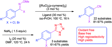 Ruthenium-catalyzed intramolecular selective halogenation of O-methylbenzohydroximoyl halides: a new route to halogenated aromatic nitriles