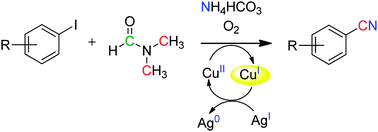 Catalytic cyanation of aryl iodides using DMF and ammonium bicarbonate as the combined source of cyanide: a dual role of copper catalysts