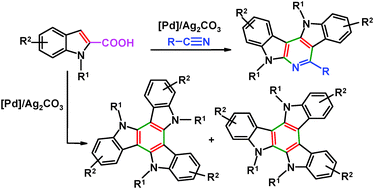 Palladium-catalysed decarboxylative nitrile insertion via C–H activation or self-coupling of indole-2-carboxylic acids: a new route to indolocarbolines and triindoles
